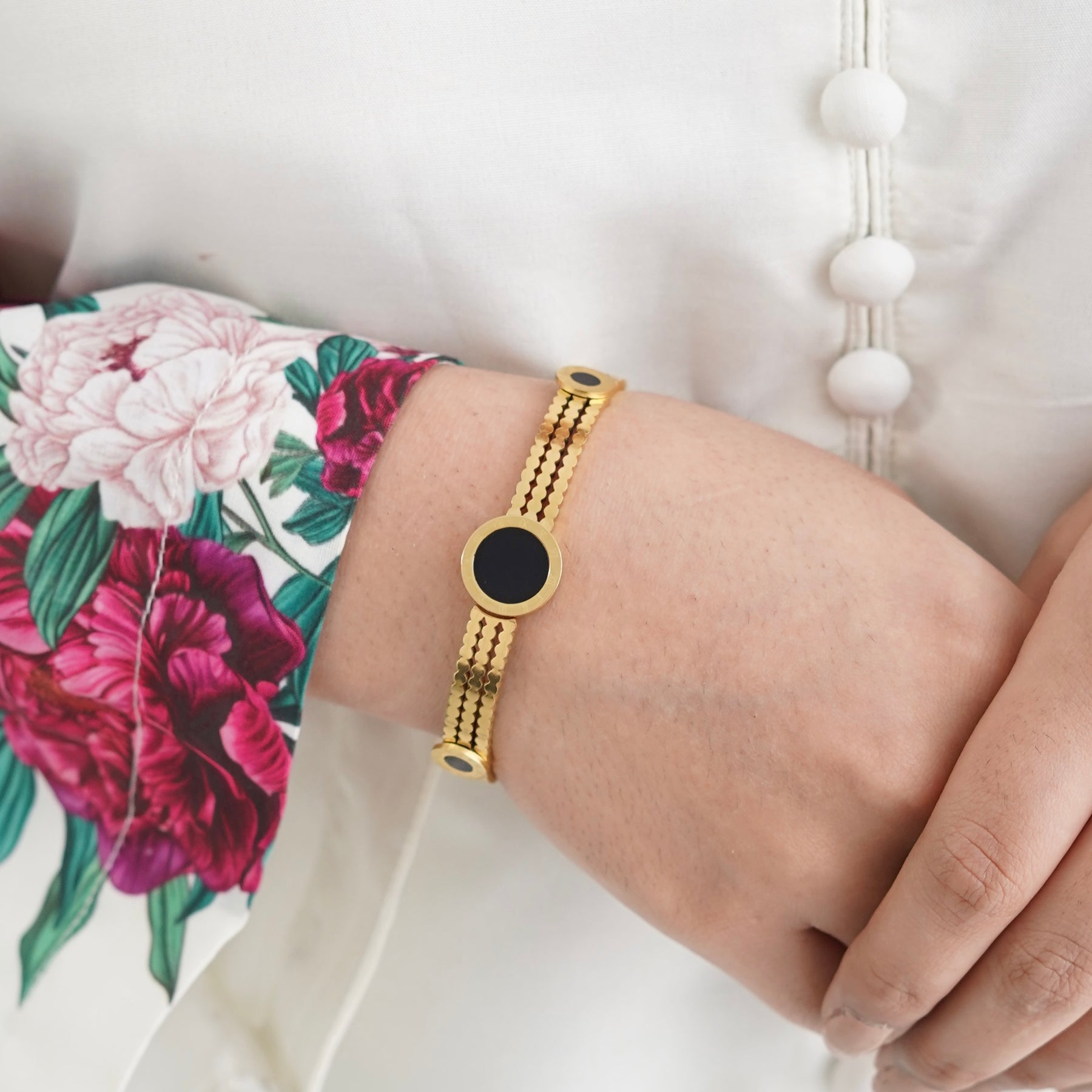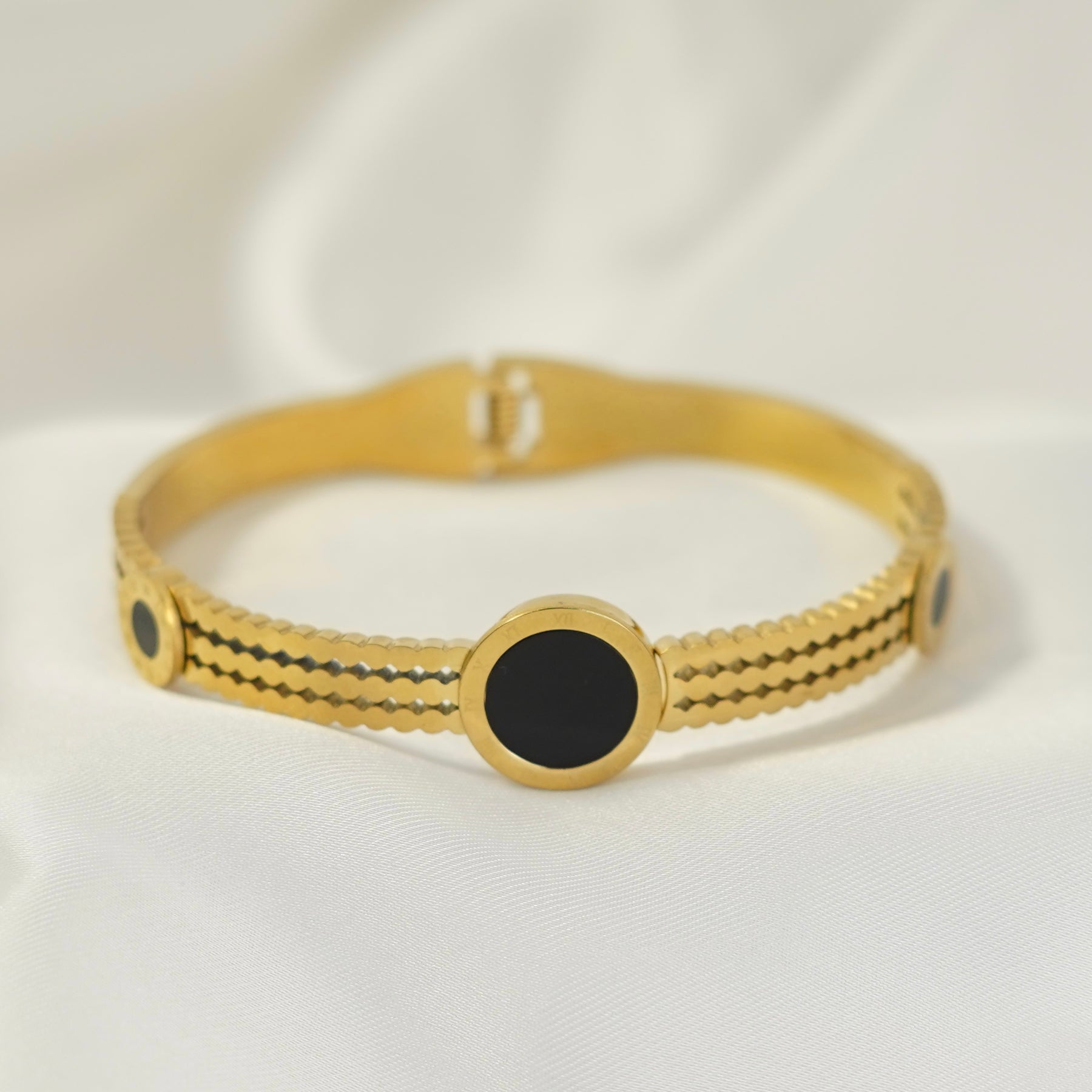 This Black Stone Roman Bangle combines classical Roman numeral charm with a bold black stone centerpiece.