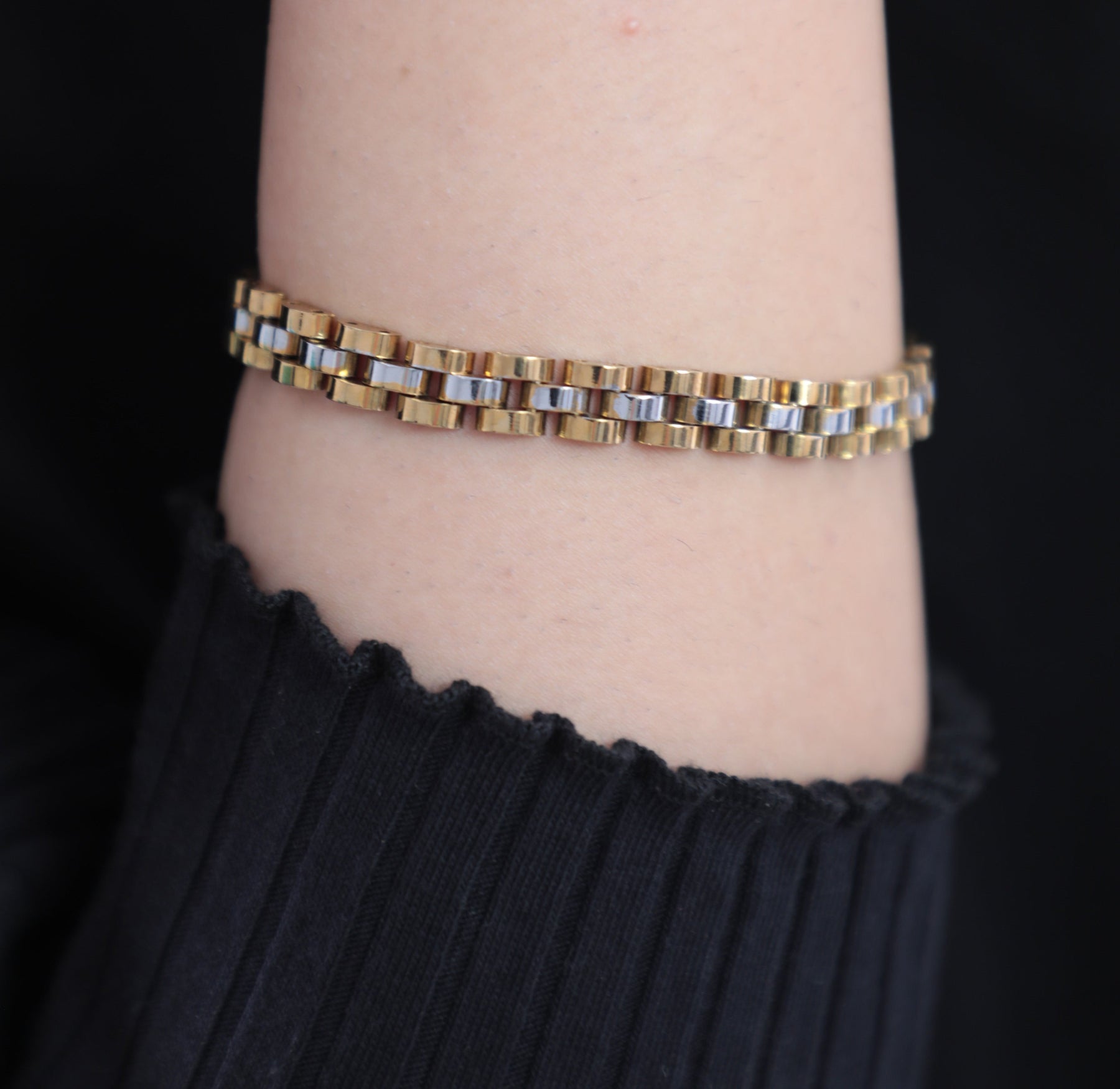 This Dual-Tone Watch Strap Bracelet blends modern edge with timeless elegance.
